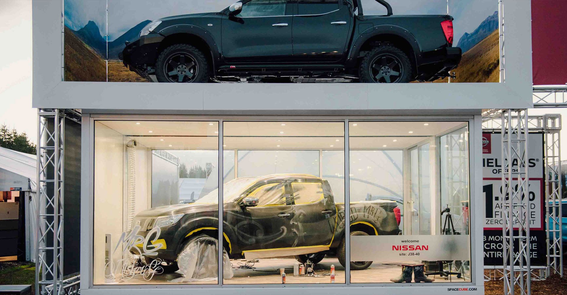 Two Spacecubes and 242m of truss were used to create an impactful street front, not only did this clearly showcase the Navara Warrior and Nissan brand from afar but provided the perfect platform for artist Mr G to entertain the crowd by custom spray painting his own Navara. Walking through the site, there was plenty of space to easily and comfortably view the vehicles and liaise with the Nissan customer representatives. The sleek marquee systems also provided a perfect platform for showing off the newest Nissan Leaf and Nissan GTR, as well as engaging visitors with an interactive PlayStation driving experience and offering a relaxed seating and hospitality zone.