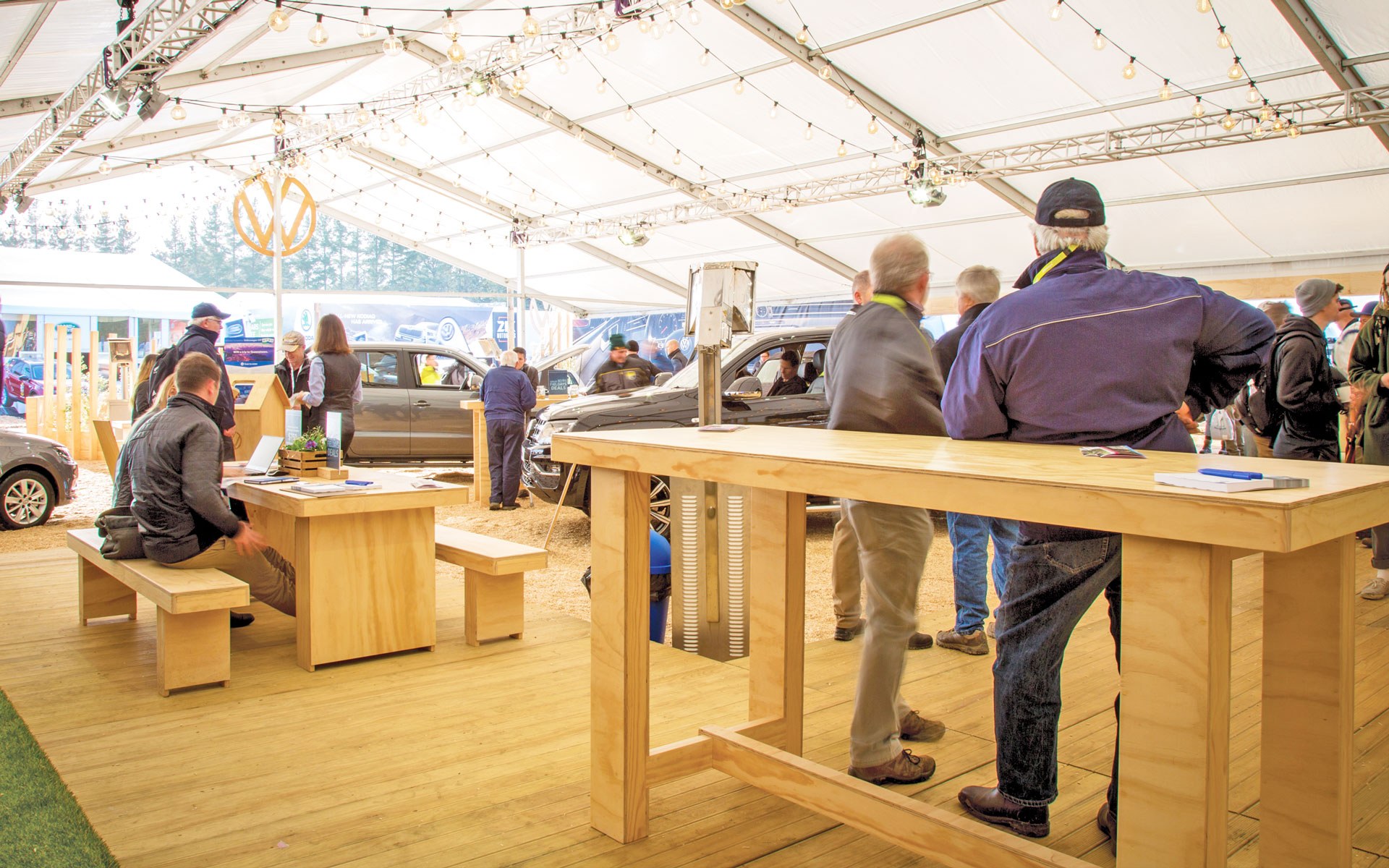 To create an impactful and eye-catching space, our designers, timber specialists, and events team came up with a truss and stretch roof structure with a spacious open plan design. The space utilised audio-visual elements, bespoke branded wooden elements, custom VW picnic tables and bench seats, a coffee counter, specialised merchandise area and private back of house zones. The design theme had an inviting Scandanavian feel, brought together by carefully crafted pine elements, as well as ceiling to floor signage with forest imagery and living back walls. The spacious seating areas with hot coffee available to attendees, created a relaxed and comfortable interactive space for people to view the Volkswagen vehicle range and talk to the sales team.